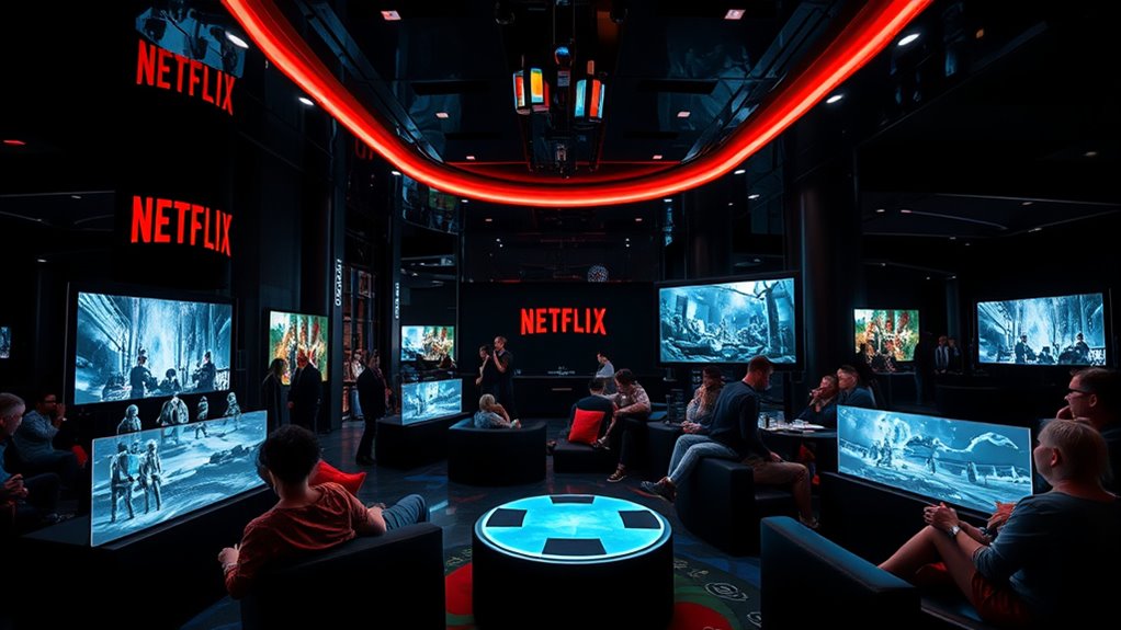 Sensory engagement plays a huge role in creating these immersive worlds. When you step into a space like the Netflix House or a themed installation, your senses are stimulated from every angle. Visuals are vivid, often enhanced with special effects or projections that make you feel like you’re inside the story. Sound design is equally important, with ambient noises, dialogue, and music that heighten the realism. Touch can be incorporated through tactile elements—textures, temperature changes, or interactive objects—adding another layer of authenticity. Smell might also be used cleverly to evoke specific environments, whether it’s the scent of forest foliage or a bustling city street. This combination of sensory inputs makes the experience feel tangible, engaging you fully and creating a sense of presence that’s hard to achieve through traditional media. Additionally, the integration of high-quality projectors enhances visual immersion, making environments more convincing and engaging.