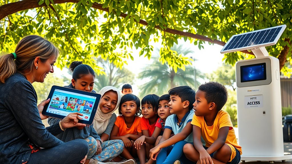 To promote equitable education, you need to address the digital divide by ensuring reliable internet access and providing devices to all students. Bridging this gap involves investing in infrastructure, offering digital literacy training, and supporting community programs. When everyone can connect and use technology confidently, educational opportunities become fairer and more inclusive. If you’re interested in ways to make a difference, explore how these strategies shape a more equal future in education.