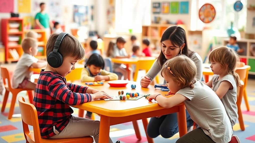 Creating an inclusive classroom involves recognizing and valuing each student’s unique strengths and challenges. You can support neurodiversity and special needs by using assistive technologies like speech-to-text tools, audiobooks, and adaptive devices. Encouraging peer collaboration fosters understanding and reduces isolation. Designing accessible group activities with clear roles helps all students participate meaningfully. By embracing these strategies, you build a respectful environment where every learner can thrive—if you keep exploring, you’ll discover more ways to make this happen.