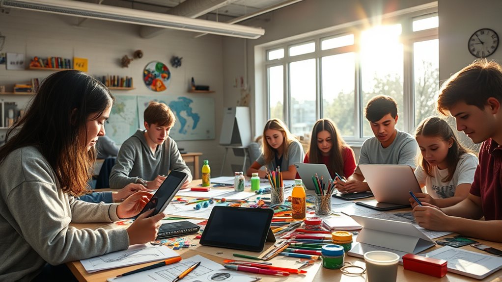 To cultivate creativity through project-based learning, focus on engaging students in real-world problems that spark curiosity and encourage exploration. Use collaborative projects that allow students to take ownership of their learning and develop critical thinking, problem-solving, and innovation skills. Incorporate authentic scenarios and flexible assessments that highlight growth and effort. Creating a supportive environment helps students express ideas freely and experiment with new approaches. Keep exploring, and you’ll discover even more ways to foster creative, active learners.