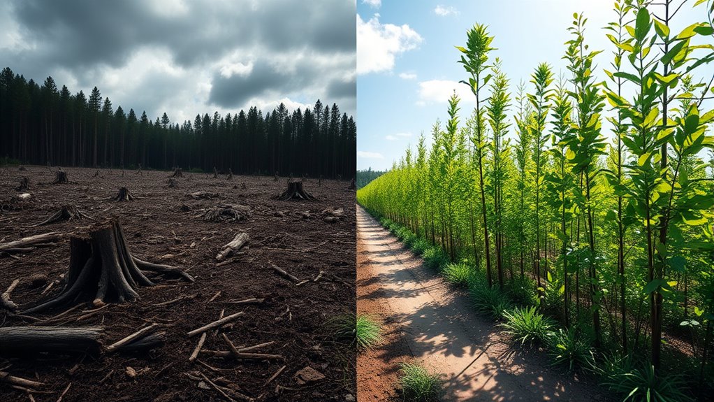 You might think reforestation alone can fix deforestation, but it’s more complex. Some studies suggest planting trees isn’t enough if soil quality and biodiversity aren’t restored too. Real recovery happens when you protect existing forests and address root causes like agriculture and logging. So, while reforestation is essential, it’s only part of the solution. To truly restore forests, you need a holistic approach that tackles both damage and prevention.