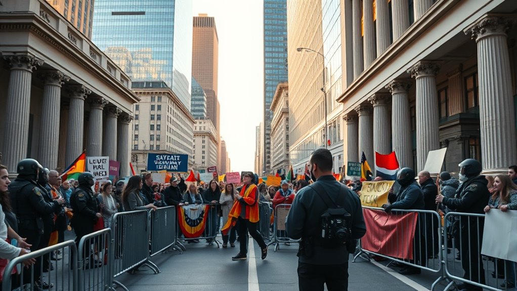 Immigration law battles often pit sanctuary city policies that focus on community trust and protecting vulnerable populations against federal efforts to strengthen border security and enforce immigration laws. Supporters of sanctuary policies argue that cooperation should respect human rights, while opponents believe stricter enforcement is necessary to combat illegal crossings and crime. This ongoing conflict reflects deeper debates over national security, values, and community bonds. If you keep exploring, you’ll discover how these issues continue to shape the future of immigration law.