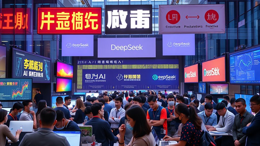 AI startups like China’s DeepSeek are challenging established tech giants by focusing on niche markets and innovative solutions. They leverage advanced analytics, AI-driven insights, and specialized technical improvements to disrupt traditional industry leaders. By emphasizing agility, experimentation, and customer needs, these startups push boundaries and accelerate technological progress. If you want to understand how these disruptors are reshaping the landscape and what strategies they use, there’s more to uncover ahead.