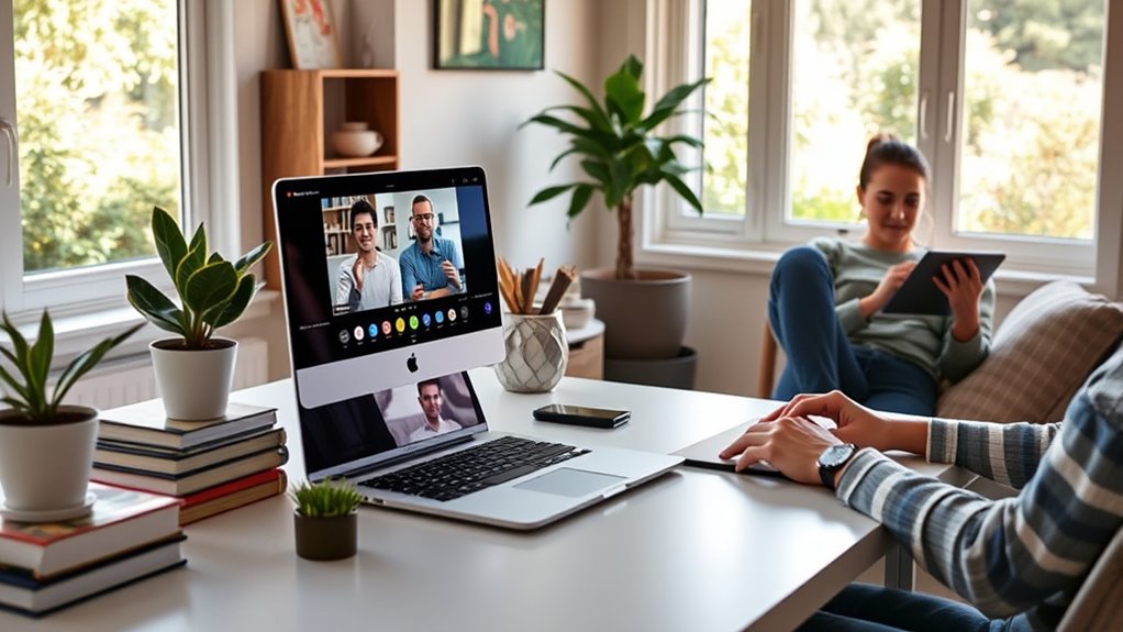 Hybrid work can improve your work-life balance by offering flexible scheduling, allowing you to manage work around personal commitments. However, it also requires boundary setting to prevent work from spilling into your personal time. By clearly defining work hours and sticking to them, you guarantee a healthier balance. This approach helps you stay productive while also enjoying time with family and friends, reducing burnout and boosting overall well-being.