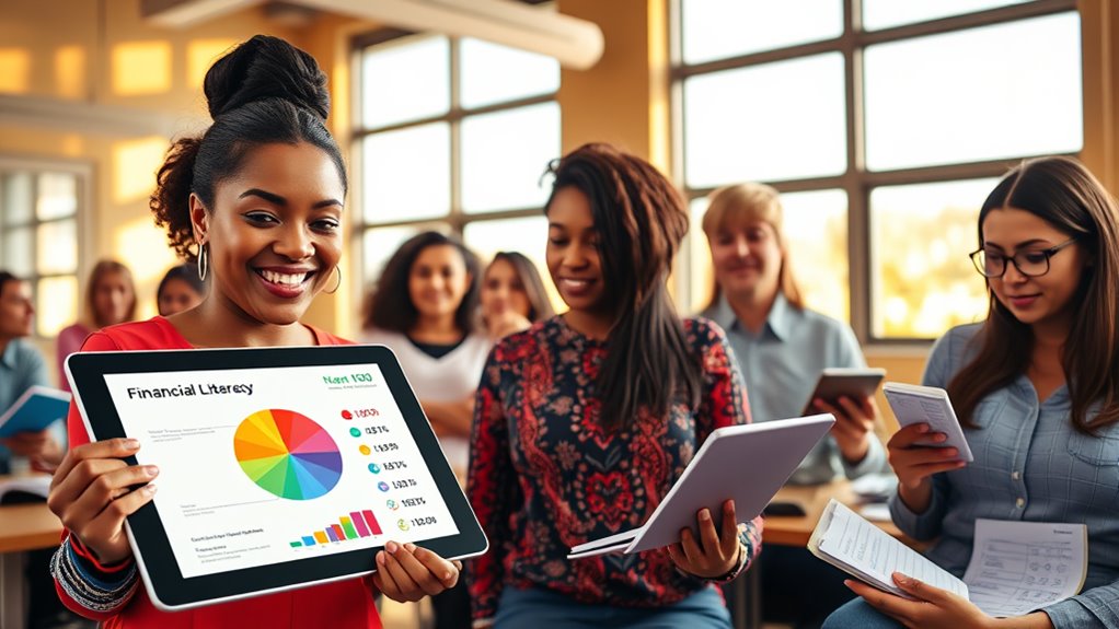 Financial literacy boosts your long-term stability by helping you understand compound interest and smart investment strategies. When you’re knowledgeable, you make better decisions, like saving regularly and choosing investments that grow over time. This awareness guarantees your money works for you, building wealth steadily. By staying informed, you avoid costly mistakes and secure a more stable financial future, empowering you to achieve your goals with confidence and resilience.
