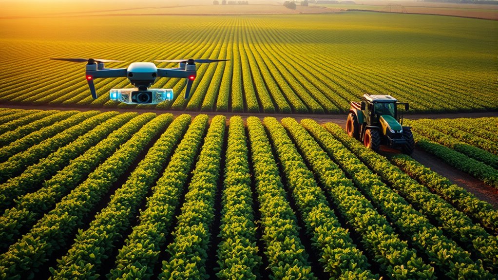 AI-driven precision agriculture helps you optimize your farming by using sensors, drones, and satellite imagery to monitor crops in real-time. This technology allows you to detect issues early, reduce pesticide use, and apply resources more efficiently, supporting sustainable practices. It minimizes environmental impact while increasing your farm’s productivity. If you’re interested in finding out how these innovations can transform your approach, there’s more to explore that can guide your efforts.