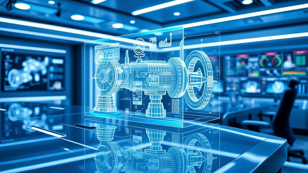 Virtual modeling is at the core of digital twins. It involves building a precise digital replica that reflects the current state of its physical counterpart, incorporating data from sensors and IoT devices. This detailed virtual model enables continuous monitoring and testing, so you can experiment with modifications and predict outcomes without disrupting actual operations. As a result, you gain deeper insights into how your assets perform under different conditions, helping you optimize maintenance schedules, improve efficiency, and extend equipment lifespan.