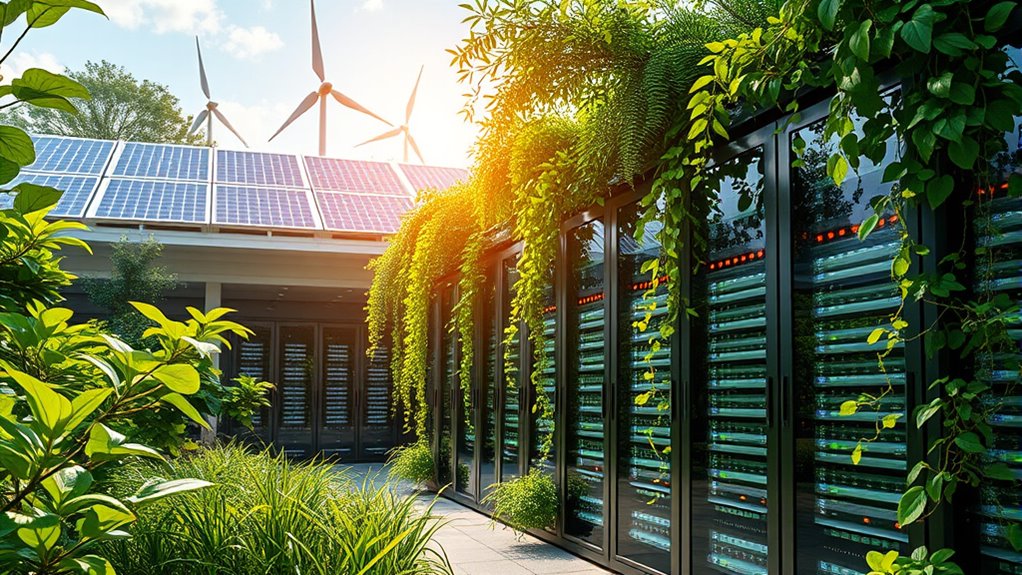 Did you know that new eco-friendly data centers are cutting energy consumption by up to 40%? You’ll find innovations like energy-efficient cooling systems that drastically reduce heat waste, and renewable energy integration powering operations with wind or solar. These advancements help data centers minimize their carbon footprint while maintaining performance. By adopting these cutting-edge solutions, you can support sustainability goals and reduce environmental impact effectively.