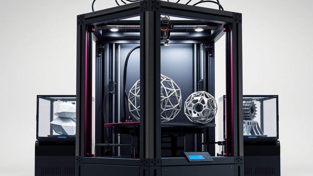 If you’re searching for the top large-format 3D printers in 2025 that balance incredible size with precise results, I recommend checking out models like the Creality K2 Plus, GK3 Ultra, and Anycubic Kobra 3 Max. These machines offer massive build volumes, advanced multi-material support, and high speeds, making them ideal for professional projects. Keep exploring — you’ll find even more details on features and performance that can meet your needs.