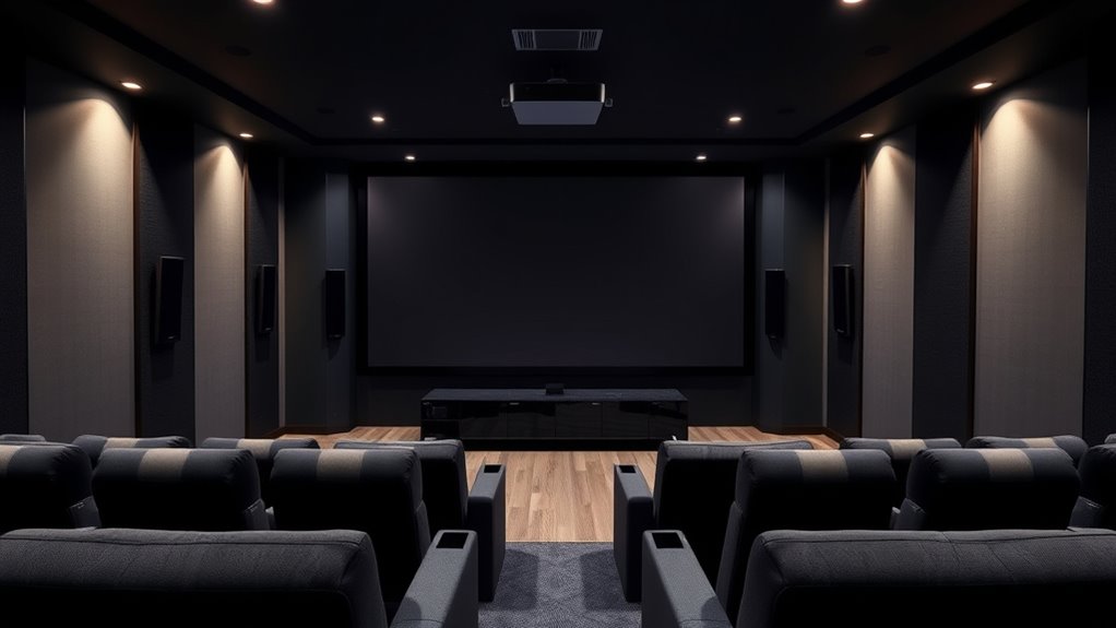 Selecting the right screen size and throw ratio is essential for optimizing your home theater setup. The throw ratio determines how far the projector must be placed from the screen to produce your desired image size. Ultra short throw models can project large images from just inches away, making them perfect for small rooms. Fixed throw ratios specify exact distances needed for specific screen sizes, simplifying placement planning. A lower throw ratio, like 0.25:1, allows for very close installation, ideal when space is limited. Adjusting the throw ratio or using motorized focus helps fine-tune image size and clarity, especially if room dimensions vary. Ensuring compatibility between your projector’s throw ratio and your chosen screen size guarantees a well-proportioned, distortion-free picture.