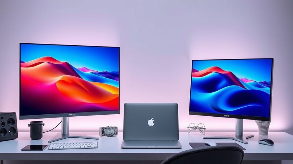Selecting the right resolution and screen size for your Mac monitor can considerably impact your workflow and visual experience. Higher resolutions like 5K and 6K deliver more pixels per inch, resulting in sharper images and finer detail — perfect for creative professionals. A typical 5K monitor measures around 27 inches with a resolution of 5120×2880, offering about 218 PPI, ideal for detailed editing and design. 6K monitors tend to be larger or have even higher pixel density, making them suitable for demanding tasks like 3D modeling or large-format printing. When choosing, consider your usual viewing distance to avoid pixel peeping or eye strain. Balancing screen size with resolution ensures you get an expansive workspace without sacrificing image clarity or comfort.