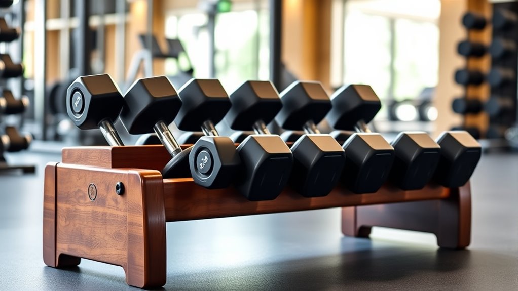 Imagine your dumbbells exploding apart mid-lift—that’s what a faulty adjustment mechanism could do! A secure, precise weight adjustment system keeps your weights locked tight, preventing slips or sudden shifts. This is vital for workout safety because it guarantees stability and control, reducing the risk of injury. Trust me, a reliable adjustment mechanism means you can lift confidently, pushing your limits without fear of accidents or mishaps.