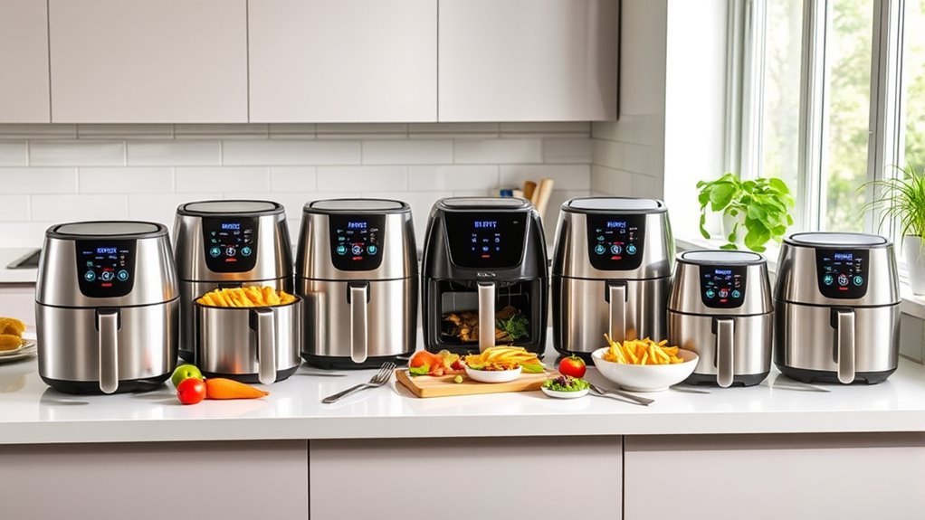 Imagine a tiny hamster running tirelessly on a wheel—that’s how energy-efficient these large-capacity air fryers are. They use less power than traditional ovens, saving you money on your electricity bill. I’ve found them surprisingly eco-friendly, especially considering their size. So, if you’re worried about energy consumption, rest assured, these giants are smart, sustainable choices that make cooking easier without draining your wallet or the planet.