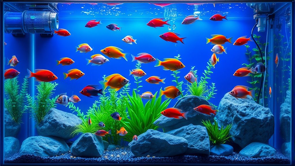 I guarantee fish stress is minimized by choosing kits with adjustable flow filters to prevent strong currents, and quiet, energy-efficient pumps for a peaceful environment. Many kits also include built-in lighting timers, so the light cycle mimics natural conditions, reducing stress. Additionally, some come with splash guards or covers that prevent fish from jumping out. These safety features help create a calm, stable space that promotes healthy, happy fish.