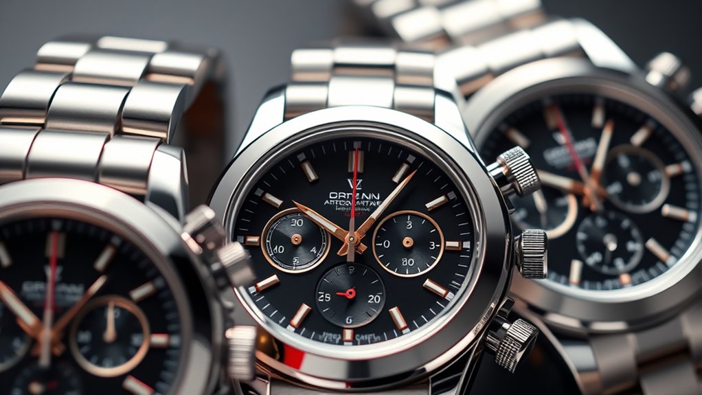 Luxury automatic chronographs stand out because of their superior craftsmanship, precision, and exclusive materials. I notice their intricate movements, often handcrafted, which guarantee accuracy and durability. These watches also feature elegant designs with premium finishes, making them more than just timepieces—they’re status symbols. Unlike standard models, luxury chronographs offer a blend of artistry and technical mastery, providing both reliability and a touch of sophistication that truly sets them apart.