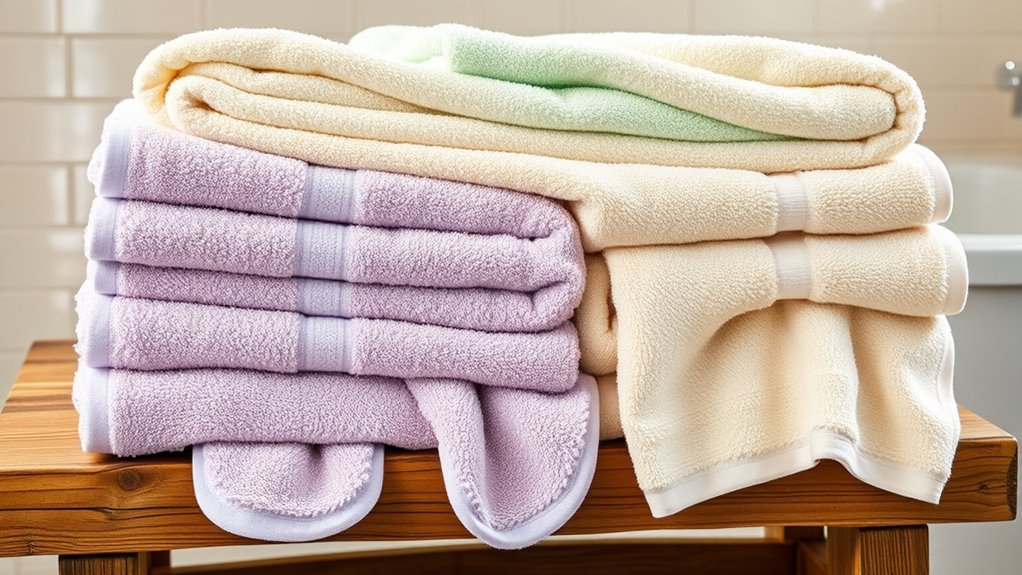 Choosing the right care routine is essential for maintaining your bath towels’ softness, absorbency, and vibrant color. I always wash new towels separately first to set the stage for long-lasting quality. Using mild detergents and steering clear of bleach, fabric softeners, and ironing helps preserve the fabric’s integrity and prolongs their lifespan. I prefer washing in cold or warm water and tumble drying on low heat to reduce lint shedding and prevent fiber damage. While towels may shed lint initially after multiple washes, this diminishes over time with proper care. To keep them fresh and odor-free, I make sure they’re thoroughly dried between uses and stored in a well-ventilated area. Proper maintenance ensures your towels stay plush and functional longer.