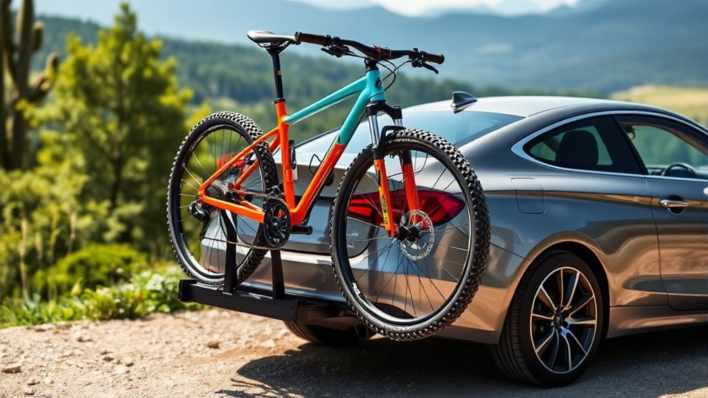 Security features are essential to guarantee your bikes stay safe and secure during transport. Locking mechanisms, straps, and clamps prevent theft and unauthorized removal, giving you peace of mind. Padded hooks and coated contact points protect your bikes from scratches while ensuring they stay firmly in place. Some racks come with integrated locks or are compatible with padlocks, adding an extra layer of security for both bikes and the rack itself. Anti-theft features like lockable hitch pins or cable locks make it harder for someone to steal your equipment. Properly secured racks minimize shifting or falling, reducing the risk of damage or theft. Prioritizing these security elements helps keep your bikes safe, whether you’re parking your car for a quick stop or leaving it unattended overnight.