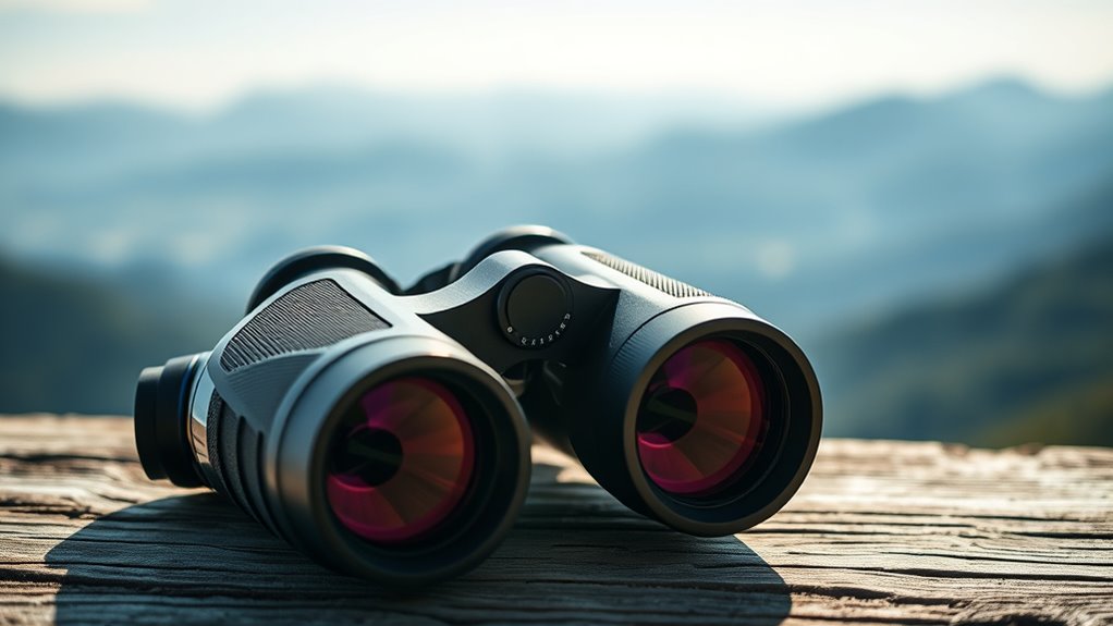 High-quality optical coatings are essential for getting the clearest, brightest images during long-range viewing. Fully multi-coated lenses maximize light transmission and cut down reflections, resulting in sharper, more vibrant images. BAK4 prism glass is preferred because it offers superior light refraction and minimizes distortion, boosting overall sharpness and color accuracy. Multi-layer coatings on lenses help reduce glare and ghosting, which is especially important when viewing high-contrast scenes at great distances. Dielectric coatings on prisms improve reflectivity, making images brighter and true-to-life, even in low-light conditions. Durability of these coatings also matters; high-quality coatings resist scratches and environmental damage, ensuring that your binoculars maintain top optical performance over time. Choosing the right coatings can make a significant difference in your long-range viewing experience.