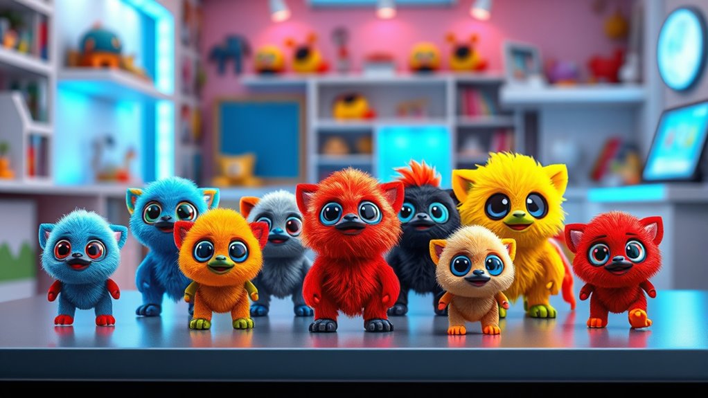 Have you ever wondered how a digital pet can feel truly alive? The key is in its interactive features. I look for pets that respond to touch and gestures, like petting, tilting, or swiping, making playtime immersive. Sound effects, magical transformations, and responsive behaviors add excitement and realism, keeping kids engaged. Special modes like care routines, mini-games, or evolution stages encourage nurturing play and make the experience more dynamic. Consistent, entertaining feedback from the pet is essential to foster imagination and interaction. When choosing a Bitzee digital pet, I focus on how well it reacts to different interactions, ensuring that the responses feel natural and engaging. These features transform a simple toy into a lively companion that sparks creativity and joy.