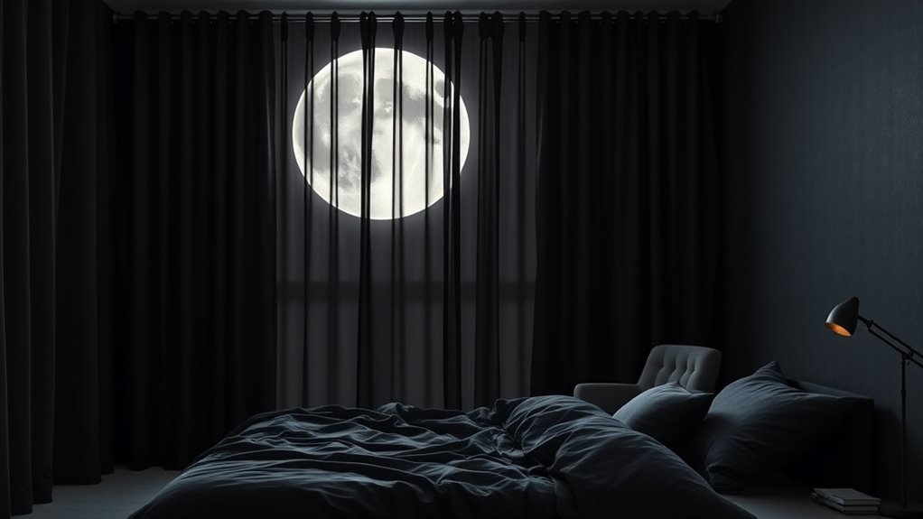 Dense, triple-layer fabrics are highly effective at reducing ambient noise, often lowering sound levels by around 30%. The thick, heavyweight materials in blackout curtains absorb sound waves, helping to block out external noise and creating a quieter space. Curtains with sewn-in blackout linings or black liner backing further improve soundproofing by sealing gaps and preventing sound from passing through window spaces. Proper installation also matters—using wider or overlapping panels can help seal edges and minimize sound leaks. Keep in mind that the overall noise reduction depends on fabric density, curtain thickness, and how well they fit your windows. High-quality options can cut noise levels by up to 50%, making your bedroom a true sleep sanctuary.