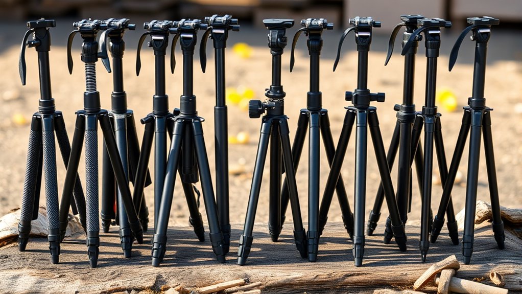 Tripod materials greatly influence durability and weight, and we find that aluminum offers a great balance, being sturdy yet lightweight enough for portability. Carbon fiber, although pricier, provides superior strength and lighter weight, making it ideal for travel and rugged conditions. Aluminum is durable but heavier, perfect for studio use. So, depending on your needs, choosing the right material guarantees your tripod lasts and remains easy to carry.