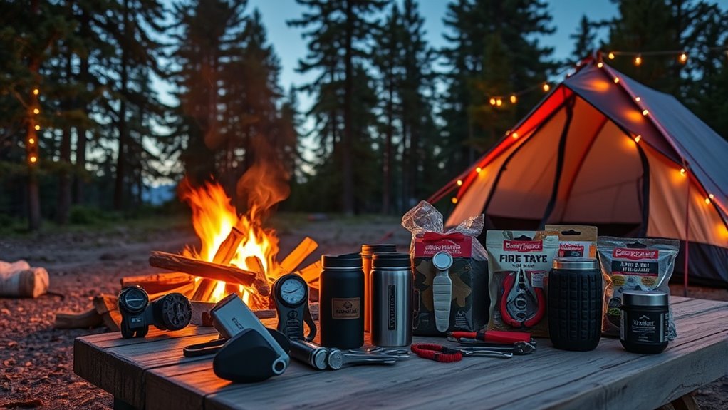 If you’re looking for top camping gifts for men in 2025, I suggest options like noise-canceling wireless headphones, a durable GPS cycling computer, or a sleek indoor hydroponic garden for fresh herbs. Handy gadgets like smart glasses or a smartwatch with outdoor features also make great stocking stuffers. Easy-to-use, multi-functional items that suit outdoor adventures or cozy home setups stand out. Keep exploring to find even more ideas for the perfect gift that will impress any guy.