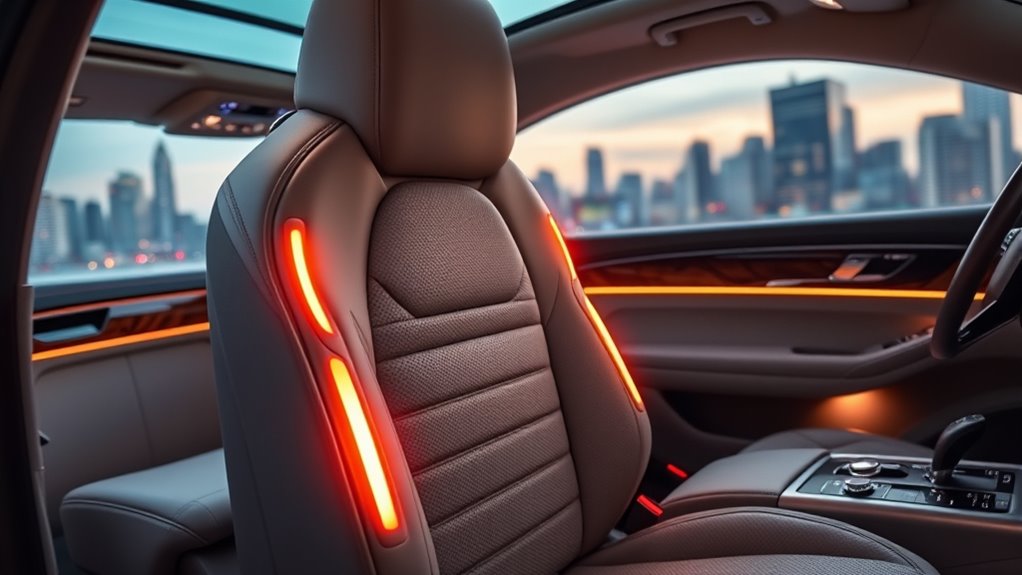 Safety and comfort go hand in hand when selecting a premium car seat massager, especially with features like heating. Look for models with adjustable temperature levels so you can customize the heat to your preference while avoiding overheating. Overheat protection systems are essential—they automatically shut off the device if temperatures get too high, ensuring safe use. Many massagers also offer independent temperature controls, letting you turn heating on or off without affecting the massage options. Safety features like automatic shut-off timers, typically set for 20-30 minutes, help prevent prolonged overheating. Additionally, the materials used in heating elements should have durable insulation and meet safety standards to reduce risks of burns or electrical issues. Prioritizing these features guarantees a safer, more enjoyable experience.