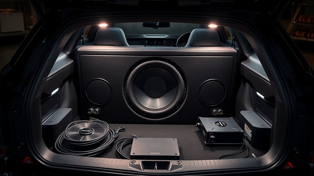 Selecting the right car subwoofer hinges on understanding how size and space fit into your vehicle’s layout. The size, such as 8 or 12 inches, affects the bass output and installation space needed. Shallow-mount subwoofers, with depths around 2.5 to 3.5 inches, are perfect for tight spots like under seats or behind panels. Larger subwoofers, ranging from 10 to 15 inches, produce deeper, more powerful bass but require more room and suitable enclosures. It’s vital to measure your vehicle’s available space accurately to guarantee the subwoofer fits without blocking other components or sacrificing comfort. Matching the subwoofer size to your enclosure—sealed or ported—is essential for maximum sound quality. Proper sizing guarantees both powerful bass and a clean installation.