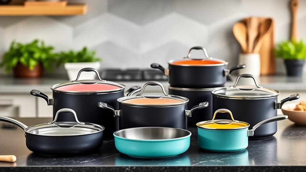 Selecting a cookware set that matches your cooktop type guarantees ideal performance and safety. It’s vital to verify that the set is compatible with your specific stove, whether induction, gas, electric, or ceramic. Look for features like magnetic bases or specialized materials that support induction cooking. Make sure the cookware can handle high heat levels if you often cook at high temperatures. Proper heat distribution is also critical, so check that the design fits your stove’s surface size and shape. If you plan to transfer from stovetop to oven, choose sets that are explicitly labeled oven safe. Ensuring compatibility not only enhances cooking efficiency but also prevents damage to your cookware or stove, making your kitchen safer and more functional.
