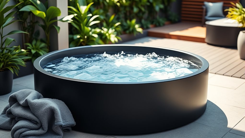 Choosing the right size and capacity for a cold plunge tub is crucial to guarantee comfort, safety, and effective recovery. The size determines how many people can use the tub at once and how well it fits your space. Larger tubs, over 100 gallons, are ideal for full-body immersion, especially for taller individuals up to 6’7″ or more. Smaller models, around 86-110 gallons, are more portable but may limit immersion for very tall users or those needing extra room. Internal dimensions like diameter and height directly impact comfort, particularly for longer limbs or larger bodies. Selecting a size aligned with your personal or family needs ensures you get the most benefit from your recovery sessions without sacrificing comfort or safety.