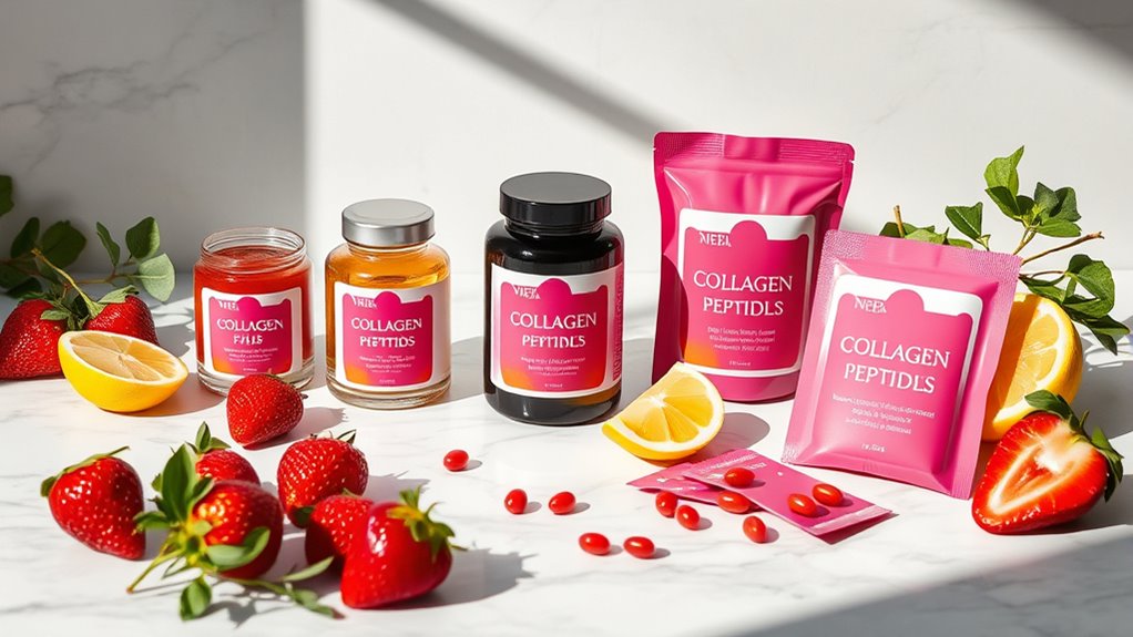 Adding ingredients like hyaluronic acid, vitamin C, and biotin can considerably boost the benefits of collagen peptides. Hyaluronic acid enhances skin hydration and elasticity, working alongside collagen to improve overall skin health. Vitamin C is essential for collagen synthesis, making collagen peptides more effective for skin, hair, and joint support. Biotin supports hair and nail growth, contributing to a more youthful appearance. Including enzymes or probiotics can help your body better digest and absorb collagen, maximizing its benefits. Additionally, antioxidants or anti-inflammatory compounds can reduce oxidative stress and joint discomfort, providing extra protection and relief. When choosing collagen supplements, considering these added ingredients can help you tailor your health and beauty goals more effectively.