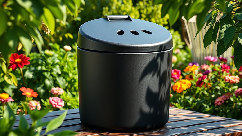 When selecting a compost bin, durability often determines how well it will hold up over time and withstand outdoor conditions. I look for bins made from high-density polyethylene (HDPE), UV-resistant polypropylene, or stainless steel, as these materials resist cracking, fading, and corrosion. Stainless steel offers excellent longevity and a sleek look, suitable for both indoor and outdoor use. UV-inhibited plastics prevent sun damage, ensuring the bin stays structurally sound for years. The hardware matters too—reinforced hinges and thick walls boost overall durability. Choosing a sturdy material means less frequent repairs or replacements, making your investment worthwhile. A durable compost bin not only lasts longer but also maintains its appearance and functionality, helping you compost efficiently without worrying about weather-related damage.