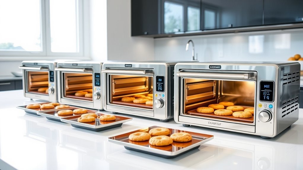 I can tell you that Cookeez Makery Ovens come with several safety features. They have automatic shut-off to prevent overheating, cool-touch exteriors to avoid burns, and stable non-slip bases for safety during use. Plus, their intuitive controls help prevent mishandling. I always feel confident using mine because these safety measures keep me protected while I bake. You’ll find these features make baking both fun and safe.