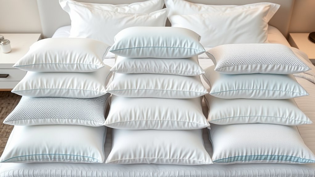 Have you ever wondered how some pillows stay cool throughout the night? It’s all about the cooling technology they use. Many pillows feature gel-infused memory foam, which absorbs and dissipates heat, keeping the surface cooler than traditional foam. Phase change materials are another option; they actively absorb, store, and release heat to maintain a consistent temperature. Breathable fabrics like mesh or moisture-wicking covers improve airflow, reducing heat buildup and enhancing comfort. Some pillows combine multiple cooling methods, such as gel infusion paired with breathable covers, for even better temperature regulation. Understanding these different technology types helps you choose a pillow that keeps you cool all night long. Each method offers unique benefits, so consider what suits your sleeping preferences best.