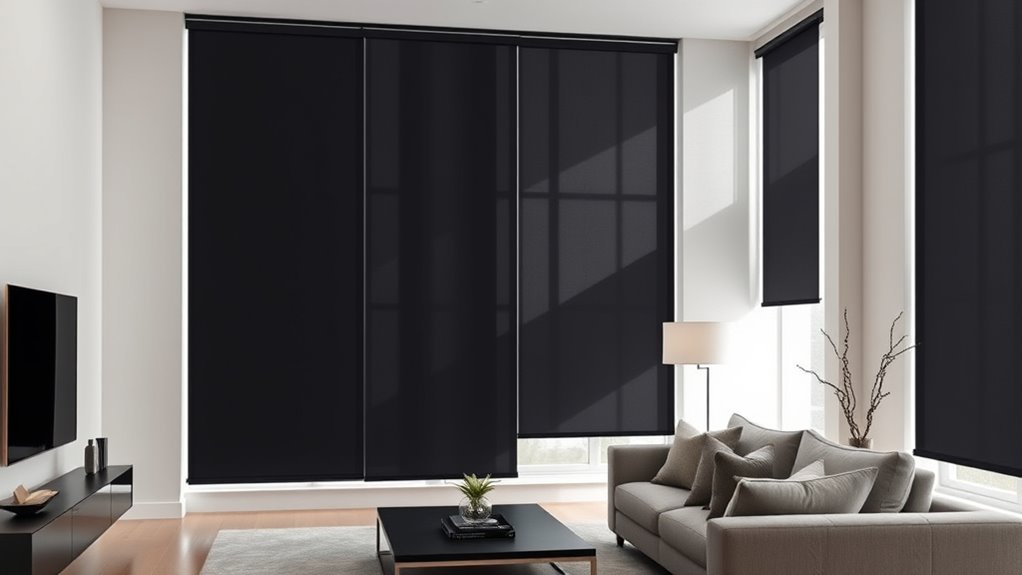 High-end blackout window treatments are quite easy to maintain. I regularly dust them with a soft cloth or use a vacuum with a brush attachment to keep them clean. For deeper cleaning, I spot clean with a damp cloth and mild detergent, avoiding harsh chemicals. I also check the cords and mechanisms periodically to guarantee smooth operation. Overall, a little routine upkeep keeps them looking sleek and functioning perfectly.