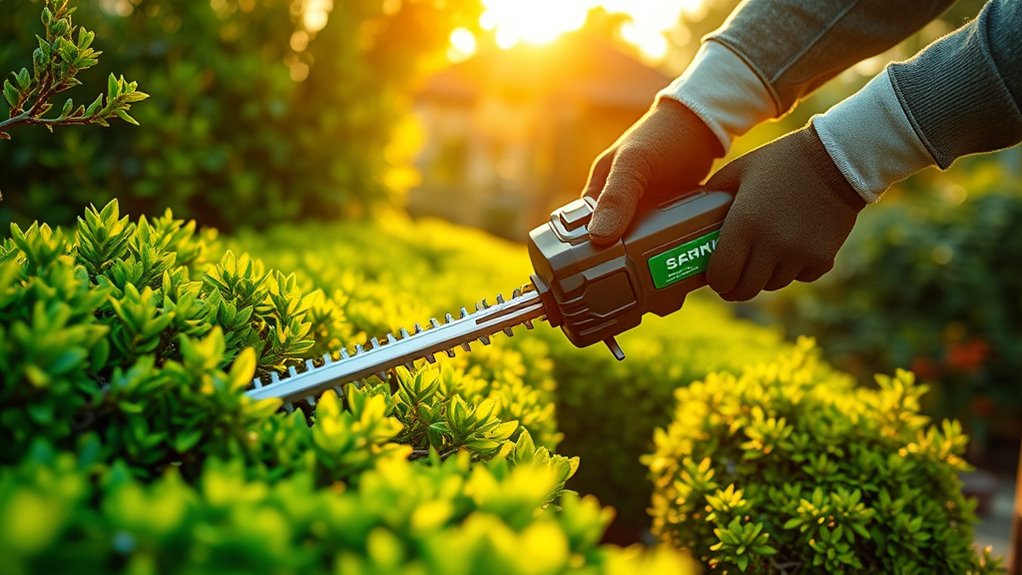 Lightweight hedge trimmers, typically weighing under 5 pounds, make it easier to maneuver and reduce fatigue during extended use. When I choose a trimmer, I look for ergonomic features like padded grips, adjustable handles, and balanced weight distribution, which boost comfort and control. Multiple grip positions, such as full wrap-around handles, allow me to trim at various angles without straining my hands or arms. A well-designed, lightweight trimmer also minimizes vibrations, decreasing fatigue and discomfort in my hands and arms. Considering the overall weight and ergonomic design guarantees I can operate the tool safely and comfortably, especially during long sessions. For anyone with limited strength or mobility, these factors are essential for a hassle-free trimming experience.