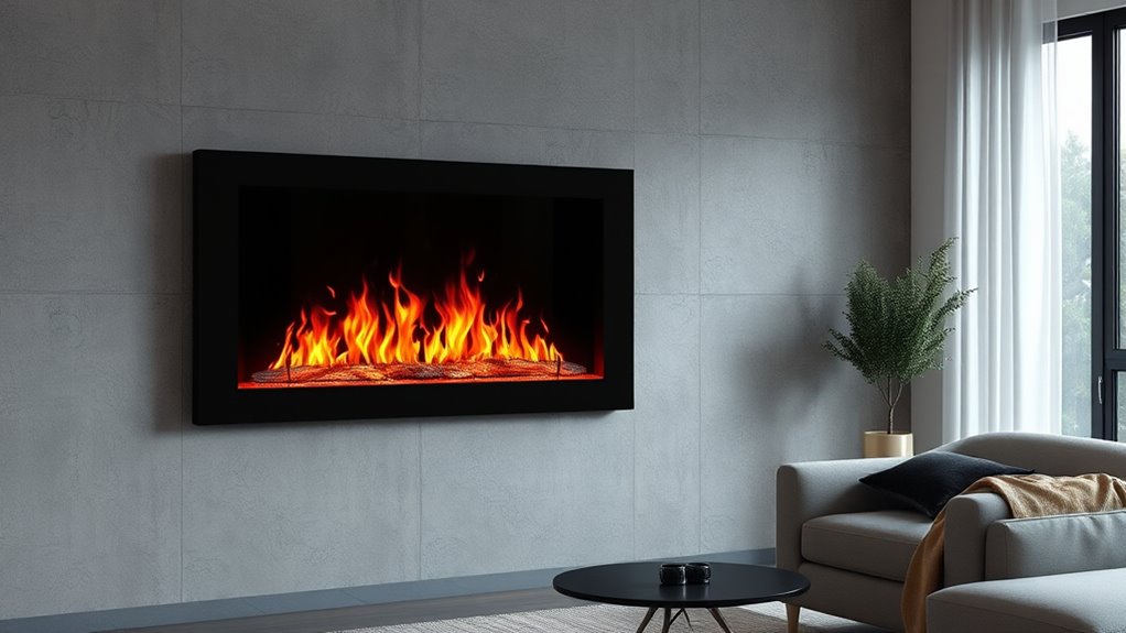 You might worry about safety, but modern wall-mounted electric fireplaces are equipped with several features. I’ve found they include overheat protection, cool-touch glass, and automatic shut-off systems to prevent accidents. These safety measures guarantee peace of mind while enjoying the ambiance. Plus, their design minimizes fire hazards, making them a safe, stylish addition to any living space.