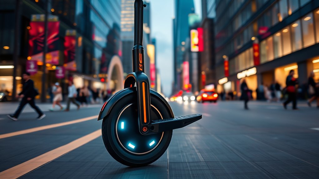 When selecting an electric unicycle for city commuting, safety features should be at the top of your list. Look for models with built-in LED headlights, taillights, or reflective surfaces to boost visibility during low-light conditions. Reliable stopping power is essential, so choose unicycles with dual disc brakes or electronic braking systems. Protective elements like fenders or mudguards help prevent debris from hitting you, especially in busy urban environments. Additionally, check if the unicycle has a robust security system, such as remote locking or GPS tracking, to prevent theft. Finally, prioritize models with certified safety standards like UL or IP ratings, which indicate compliance with electrical and water resistance safety protocols. These features guarantee a safer, more dependable ride in city conditions.