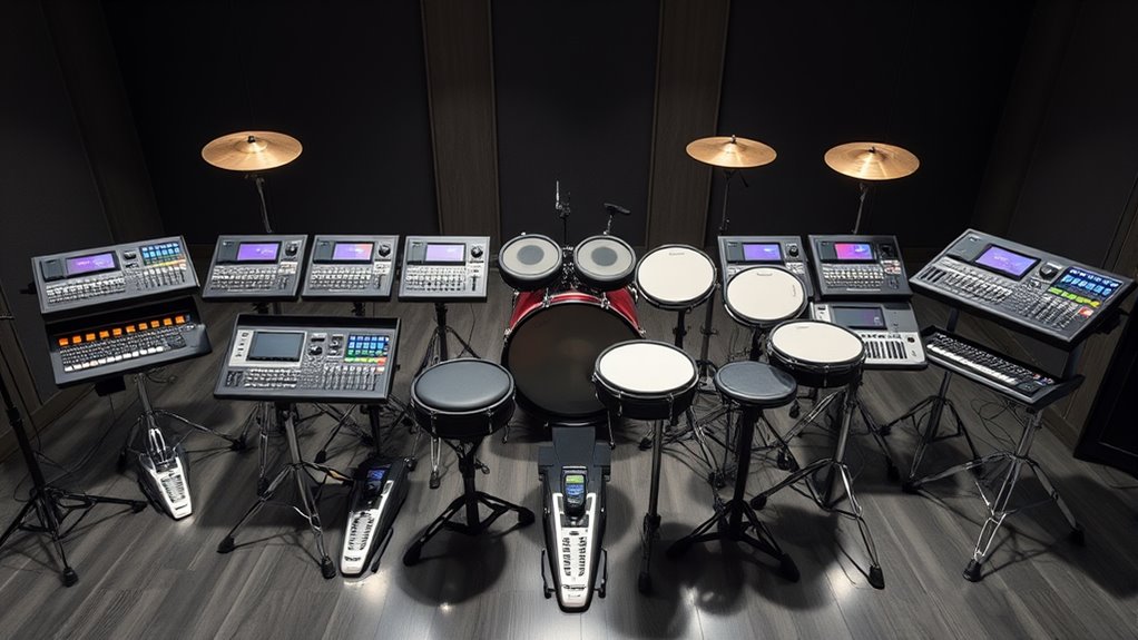 If you’re looking for the 15 best professional electronic drum kits for studio and stage use, I’ve explored top options like Roland TD-07DMK, Alesis Strata Core, Donner models, and Pyle Pro kits, which offer realistic feel, versatile sound libraries, and high-quality hardware. These setups suit both practice and live performance, with features like responsive mesh pads, customizable kits, and seamless connectivity. Stick with me, and I’ll share more details to help you choose the perfect kit.