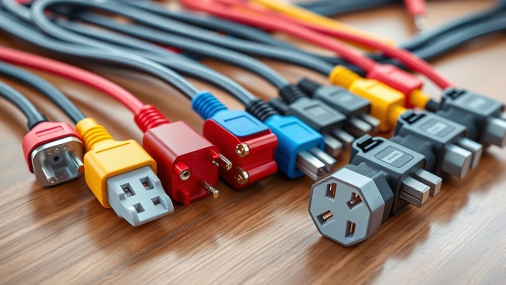 When choosing extension cords and power strips, I look for safety features like grounded plugs, surge protection, and overload switches. I also prefer cords with insulation rated for outdoor use if needed, and those with a proper amperage rating for my devices. It’s vital to check for UL or ETL safety certification to verify the product meets safety standards. These features help prevent electrical hazards and keep my devices safe.