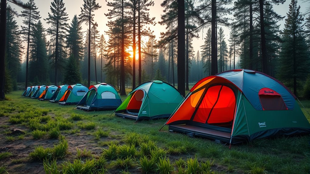 While some tents are subtly crafted for lofty adventures, I find that high-altitude camping calls for models specifically designed for such challenges. These tents often feature reinforced materials, excellent insulation, and robust stability to handle thin air and fierce winds. I recommend looking for options with strong frame support and good ventilation, ensuring you stay protected and comfortable even amidst the most elevated and demanding environments.