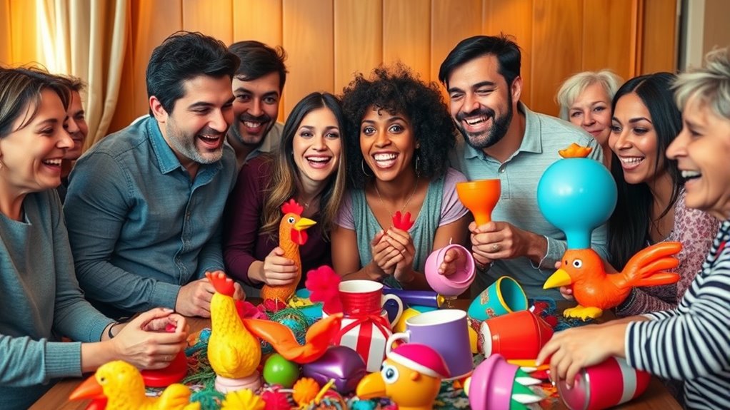 Choosing a gag gift isn’t just about the humor—it also depends on the occasion where you’ll give it. I always consider the event’s tone, whether it’s light-hearted or more edgy, to guarantee the gift fits. For casual gatherings, playful or quirky gifts work well, but for more formal events, I opt for subtler, less provocative options. It’s also essential to think about the recipient’s sense of humor and boundaries—what’s funny to one person might offend another. I check if the gift is appropriate for the setting and if it can be safely displayed or used without crossing social norms. By matching the gift’s style and theme to the occasion, I make sure my humor lands well and adds to the fun.