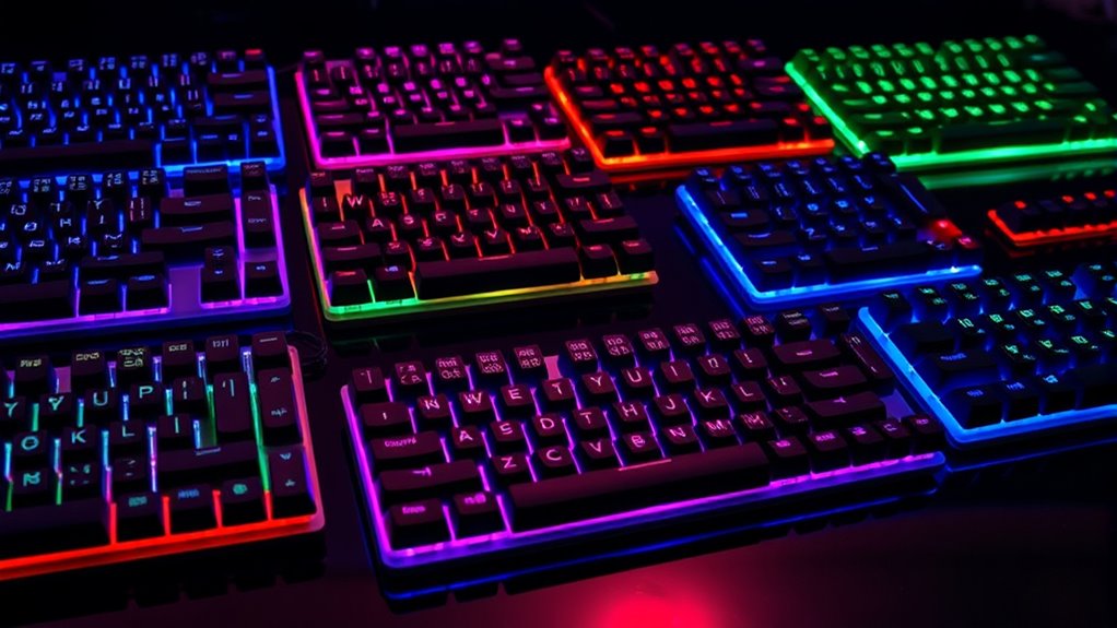 Lighting effects are a key factor when choosing a gaming keyboard, as they considerably enhance both aesthetics and immersion. RGB lighting, single-color options, and customizable patterns let us personalize our setups and match our style. Advanced modes, like reactive effects that sync with in-game actions or music, boost immersion and make gameplay more engaging. Adjustable brightness and speed let us control the visual intensity, ensuring the lighting complements our preferences. Many keyboards support multiple lighting zones, which means different sections can display unique colors and effects for added customization. Software control is essential, offering the ability to create dynamic, animated, or static displays. These features let us craft a truly personalized visual experience that enhances gaming sessions without distraction.