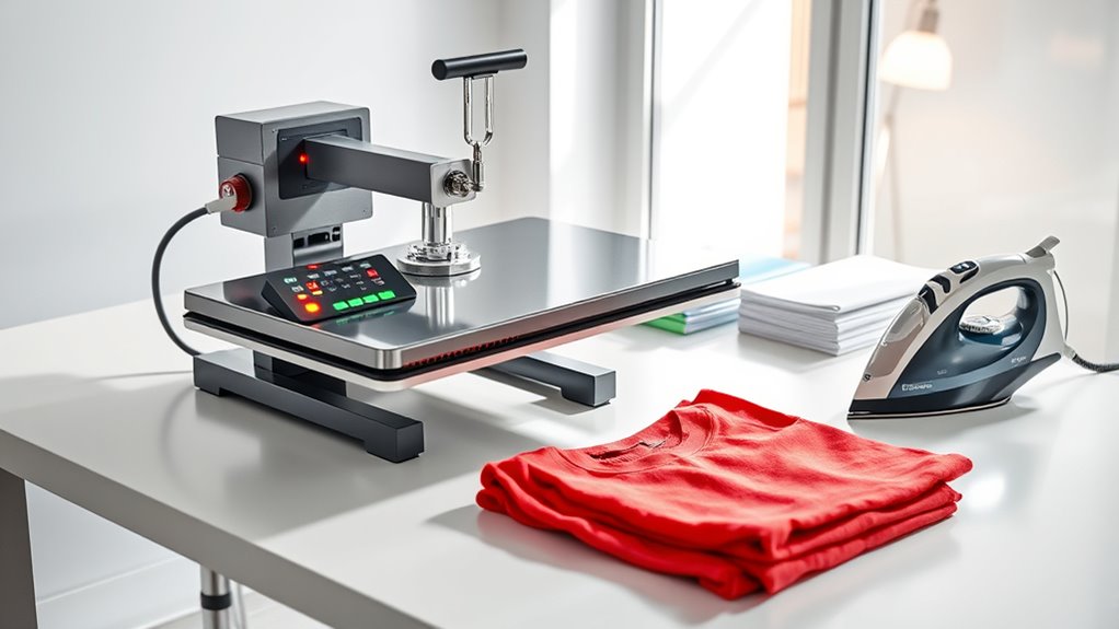Material compatibility plays a crucial role in selecting the right heat press for your T-shirt business. You need a machine that supports a variety of materials like cotton, polyester, vinyl, sublimation substrates, and even ceramic tiles, depending on your projects. Check the maximum temperature capacity—ideally up to 450°F or higher—to handle different transfer types effectively. The heating surface should accommodate various sizes and shapes; for T-shirts, a 15×15-inch platen is standard, but specialized attachments for mugs and caps can expand your offerings. Adjustable pressure settings are essential to protect delicate fabrics and thicker materials like wood or ceramic without causing damage. Finally, opt for Teflon-coated or non-stick platens to prevent sticking and ensure even heat distribution across diverse materials.