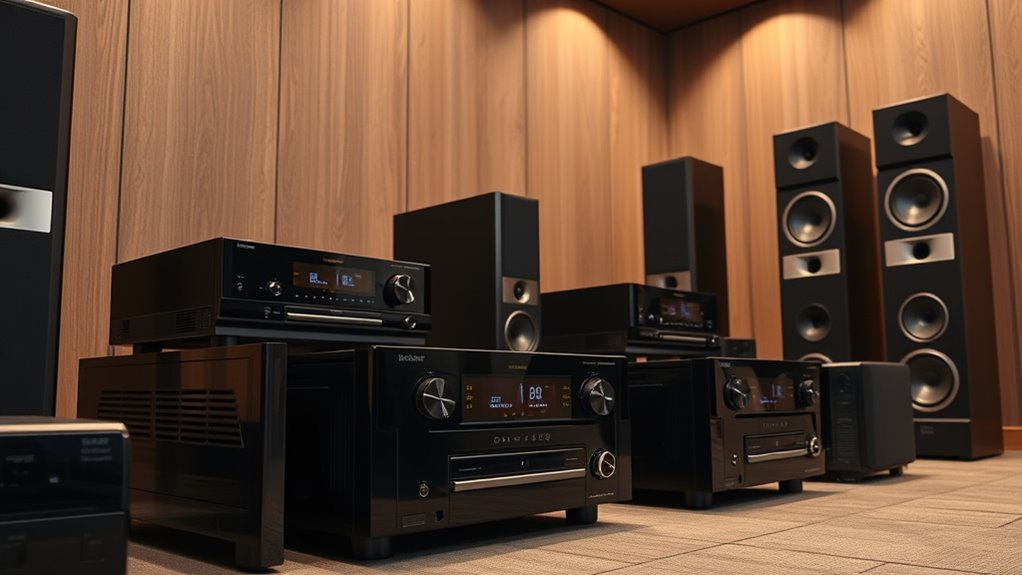 High-end Dolby Atmos receivers boost immersive audio by delivering multi-dimensional sound, making me feel like I’m right in the middle of the action. They use advanced processing to handle multiple speakers and height channels seamlessly, creating a rich, three-dimensional soundscape. I notice sharper dialogue, more detailed effects, and a much more realistic experience overall. These receivers truly transform my home theater into a cinematic environment I can lose myself in.