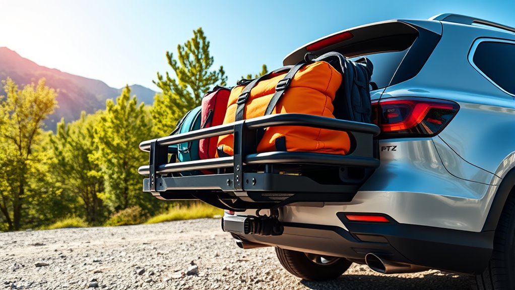 Selecting a hitch cargo carrier that can handle your gear safely starts with checking its load capacity. You want a carrier whose maximum weight limit meets or exceeds your total cargo, including any extra gear. Most heavy-duty models have at least a 500-pound limit, which is a good benchmark. It’s vital to consider how weight is distributed across the carrier to avoid overloading any one area, which can impact vehicle handling. Reinforced side rails or a sturdy mesh base help support heavier loads securely. Also, check the weight of the carrier itself—if it’s too heavy, it could reduce your overall load capacity or make installation more difficult. Ensuring these factors are met keeps your trip safe and your cargo secure.