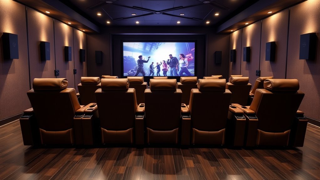 If you’re looking for the best home theater recliners, I’ve found options that combine comfort, style, and technology. From modern leather seats with adjustable headrests and built-in USB ports to massage recliners with cozy padding and ambient lighting, there’s something for every space and preference. Space-saving wall huggers and sturdy designs supporting up to 800 pounds make these seats both practical and durable. Keep exploring to discover how to choose the perfect setup for your movie nights.