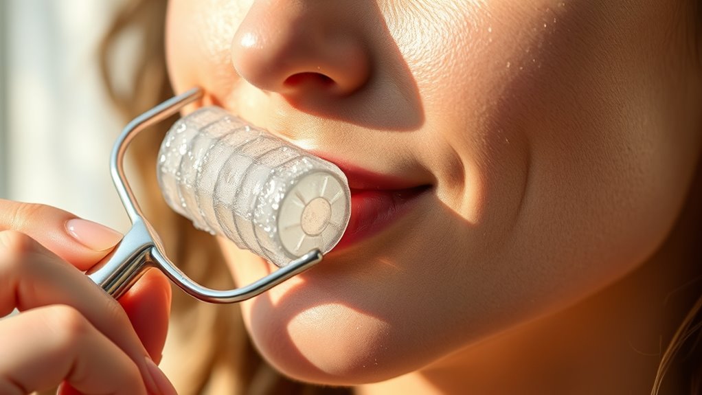 An ice roller’s ease of use can make or break your skincare experience. An ergonomic handle design guarantees a comfortable grip, so you won’t fatigue your hand during longer sessions. Its lightweight construction allows for effortless maneuvering, making it easy to target specific facial areas with precision. Smooth-gliding roller heads minimize skin tugging and discomfort, providing a soothing cooling massage that feels gentle yet effective. User-friendly controls and simple instructions make it accessible, even for beginners. Additionally, a portable and compact design makes it convenient to incorporate into your daily routine or take on the go. Overall, a thoughtfully designed ice roller simplifies your skincare, ensuring that your refreshment routine is both enjoyable and effective.