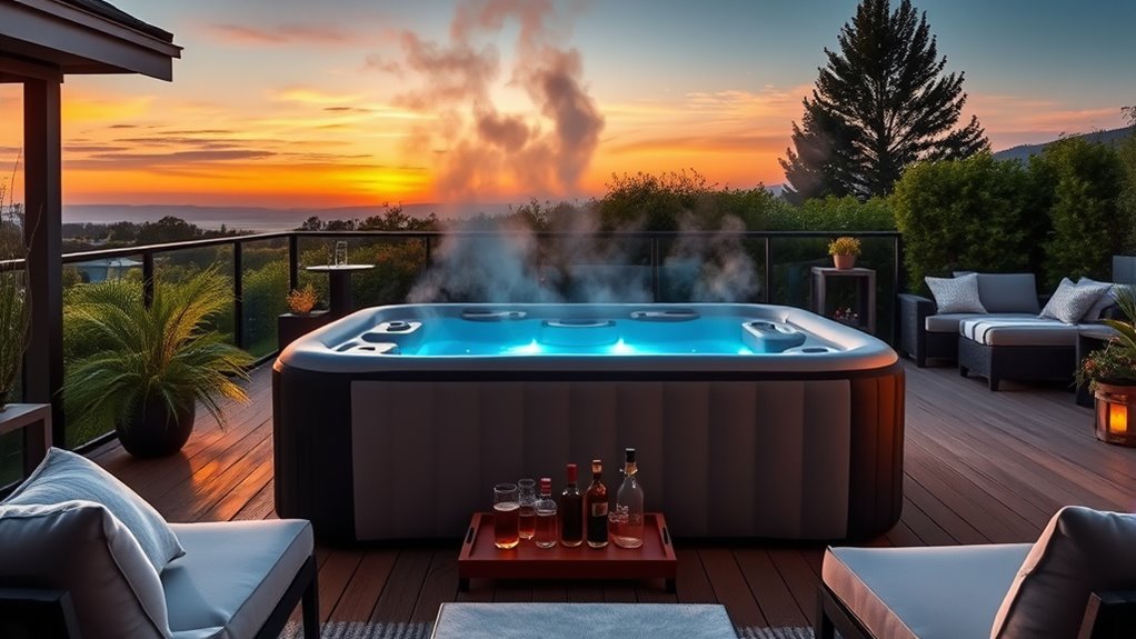 High-end inflatable hot tubs come with essential safety features like reinforced cover locks to prevent accidental entry, non-slip surfaces for safe footing, and temperature controls that automatically shut off if water gets too hot. I always look for models with sturdy, secure covers and clear instructions. These features give me peace of mind, knowing I can enjoy relaxing soaks without worrying about safety hazards or unintended use.
