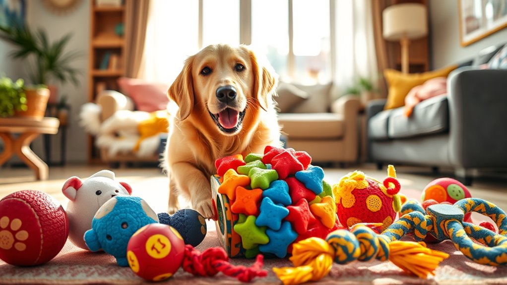 Ensuring your dog’s safety during playtime is just as important as choosing the right toy. I always supervise my pup to prevent accidental choking or ingestion of small parts. It’s vital to select toys made from non-toxic, pet-safe materials, especially since dogs often mouth or chew their toys. Regularly inspecting toys for damage—like frayed edges or broken components—is essential; replacing worn toys reduces injury risks. I also consider my dog’s activity level and temperament to avoid overly stimulating or intimidating toys. Following manufacturer guidelines for size and durability helps prevent injuries or destruction. By staying attentive and cautious, I can keep play both fun and safe, ensuring my dog enjoys his toys without unnecessary risks.